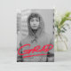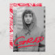 Trendy, modern graduation party invites featuring the graduate's vertical senior photo with "Grad" in red hand-lettering with an underline dash below. Personalise the front of the photo graduation party invitations by adding the graduate's name, school name, and graduation year. The invite reverses to display your graduation party details with a background of red and white dashed brushstrokes.