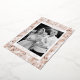 Modern foil holiday card featuring your photo framed in white with a rose gold foil dashed geometric pattern. Personalise the front with your custom holiday greeting, family name, and year in bold rose gold lettering. The back of this unique Christmas card includes space for your personal message in black lettering on a white background.