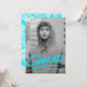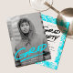 Trendy, modern graduation party invites featuring the graduate's vertical senior photo with "Grad" in turquoise hand-lettering with an underline dash below. Personalise the front of the photo graduation party invitations by adding the graduate's name, school name, and graduation year. The invite reverses to display your graduation party details with a background of turquoise and white dashed brushstrokes.