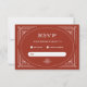 These glamourous holiday wedding rsvp response cards feature a modern spin on classic art deco. An ornate, light silver/white coloured geometric frame and ornamentation decorate an elegant Christmas red background for a dramatic, vintage wedding look.