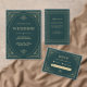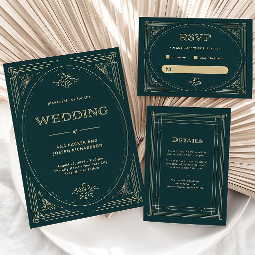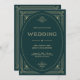 These glamourous wedding invitations feature a modern spin on classic art deco. An ornate, champagne gold look geometric frame and ornamentation decorate an elegant emerald green background for a dramatic, vintage wedding look.