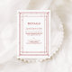 These glamourous wedding guest information cards feature a modern spin on classic art deco. An ornate, festive red geometric frame and ornamentation decorate an elegant very light silver/white background for a dramatic, vintage wedding look. You can use these cards for driving directions, reception or transportation information, hotel or accommodations information, and any other wedding details you need your guests to know. Perfect for your elegant Christmas holiday wedding.