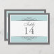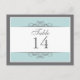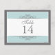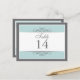 Traditional yet contemporary is the focus of this lovely table card. Soft blue bordered with white and charcoal grey make up the base. The white panel contains the table information. Double-sided design for convenience from any angle. Available in alternate colours with matching products.