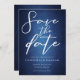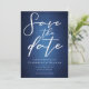 Beautiful deep shades of dark blue create a texture like water on this evening Save the Date card. Perfect lakeside or waterfront invites for a ceremony by the lake with a water view. Elegant white minimalist script with your details on a gradient that feels like you are swimming underwater.