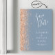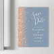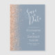 The left-hand edge of this elegant modern wedding save the date magnetic card features a peach faux glitter border. The customisable text combines white handwriting, copperplate and italic fonts on a dusty blue background.