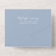 The left-hand edge of this elegant modern all-in-one wedding invitation and RSVP features a silver faux glitter border. The customisable text combines whimsical white handwriting, copperplate and italic fonts on a dusty blue background. The return address appears on the outside flap and the reverse side of the detachable RSVP card in white text on solid dusty blue.