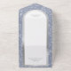 ALSO AVAILABLE WITH A QR CODE TO SCAN IN THE RSVP AREA OR WITHOUT DINNER SELECTION OPTIONS. This simple but elegant wedding invitation design features a beautiful dusty blue background with softly falling white snowflakes. The text is displayed on an arched white text area over a faux silver foil arch for extra winter sparkle. Created by Simply Farmhouse Press.