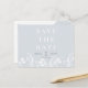 Modern Dusty Blue and White background Wedding Save the Date. White wildflowers.