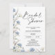Modern blue and white wildflowers bridal shower invitation featuring a lovely arrangement on the side and base. The back of the invitation is a dusty blue color.