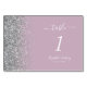 The left-hand edge of this elegant modern wedding table number features a silver faux glitter design. The customisable text combines white handwriting, copperplate and italic fonts on a dusty lavender purple background.