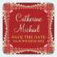 Asian Eastern inspired. Unique and Stylish alternative pattern lace borders in passionate red, gold and white - Exquisite and elegant custom Wedding, Engagement, Anniversary Save the Date rounded corner square sticker. All the text can be fully customised, including style of font and colours.
