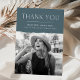 Modern graduation thank you card featuring "Thank You" at the top in white modern lettering with a slate-colored torn edge bordering the graduate's senior photo. Personalize the photo thank you card by adding the graduate's name, school name, and graduation year. The back of the card provides space for your typed or handwritten message.