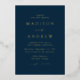 Minimalist, modern wedding invitation featuring your names and wedding details in gold foil lettering with calligraphy script accents. The navy background can be changed to a colour of your choice. Designed to coordinate with our Modern Elegance wedding collection.