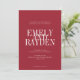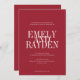 The wedding invitation features a minimalist design with an Ruby red background and a clean, symmetrical layout. It uses elegant serif fonts, with the couple's names prominently displayed in large, overlapping text for a bold and modern touch. The remaining details are arranged in a smaller, clear font, maintaining simplicity and sophistication, blending contemporary and traditional aesthetics.