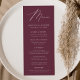 Simple and elegant wedding menu featuring "Menu" displayed in a modern white script with a wine-purple background or colour of your choice. Personalise the wine wedding menu by adding your names, wedding date, and menu information. Designed to coordinate with our Modern Elegance wedding collection.