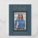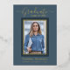 Beautifully elegant 1 photo graduation announcement cards. Featuring modern text with calligraphy script in your choice of gold, silver or rose foil. Your photo is also thinly edged in a double foil trim. The design is complimented with a background in shades dusty blue. The back of the card offers a personalised announcement text space for that special graduate. To see more items like this, visit my store here at "www.Zazzle.com/LakeViewCardCo". Thanks