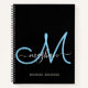 Modern, trendy girly black and light blue custom personalised monogrammed spiral notebook. This simple elegant design features white cursive hand lettering name with swashes in white and a huge hand-written monogram script in light sky blue, or baby blue colour on black background. This feminine, pretty notebook is a perfect gift idea for business, professional, school, birthday party, wedding and any party or occasion for someone that like girly and modern styles. If you need help or matching item please contact to designer.