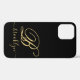 Modern, minimalist black and gold personalised name monogrammed iPhone 12 Case. It features a monogram initial in serif style font and pretty handwritten first name text template in gold, white colour on black background. Great girly, feminine personalised gift. If you need help or matching items, please contact to me.