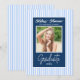 Celebrate your graduate in style with this elegant blue and white graduation announcement card, featuring a classic script design, soft striped background, and a personalized photo of your graduate. Perfect for sharing this milestone moment with family and friends, this design blends timeless charm with a modern, preppy aesthetic. Ideal for high school, college, or university graduations.