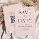 Announce your upcoming nuptials in style with our elegant, modern QR code save the date card. The non-photo save the date features "Save the Date" in black serif and script fonts with a blush background. Personalize the front of the save the date card by adding your names, wedding date, wedding location, and other wedding details. The minimal save the date card reverses to feature your custom QR code with wedding website and custom text. Perfect save the date for both modern formal and casual weddings!