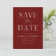 Announce your upcoming nuptials in style with our elegant, modern QR code save the date card. The non-photo save the date features "Save the Date" in white serif and script fonts with a burgundy background. Personalise the front of the save the date card by adding your names, wedding date, wedding location, and other wedding details. The minimal save the date card reverses to feature your custom QR code with wedding website and custom text. Perfect save the date for both modern formal and casual weddings!