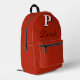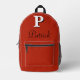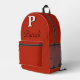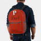 A personalised monogram backpack designed in a modern elegant style. This elegant Candy Cane Red backpack features a bold white initial 'P' with a black shadow and a customisable name in black script font. Perfect for adding a touch of sophistication and personalisation to your everyday style. Ideal for school, work, or casual outings, this backpack combines functionality with a chic design that stands out.