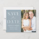 Announce your wedding date with this stylish, modern photo save the date magnet. The design features "Save the Date" in white serif and script fonts with a dusty blue background. Personalise the minimalist save the date magnet by adding your names, date, wedding location, and photo. The simple save the date magnet is perfect for any wedding theme.
