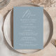 Simple and elegant wedding menu featuring "Menu" displayed in a modern white script with a dusty blue background or colour of your choice. Personalise the dusty blue wedding menu by adding your names, wedding date, and menu information. Designed to coordinate with our Modern Elegance wedding collection.