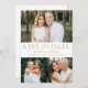 Elegant, multi-photo save the date featuring "Save the Date" displayed in gold lettering with a white background. Personalise the modern QR save the date card with 3 of your favourite photos, your names, wedding date, and wedding location. The gold save the date reverses to display your custom QR code with wedding website and custom text.