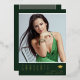Real foil, stylish graduation announcement cards, featuring modern text with an elegant and professional look in you choice of gold, silver or rose foil. The graduates photo the front of the card is enhanced by thin translucent frames on the top and bottom while the back of the card offers personalised text spaces for information about the graduation and future journey. Backgrounds are green with foil text on the front and regal shades of sage and green on the back with white text. To see more items like this, visit my store here at "www.Zazzle.com/LakeViewCardCo". Thanks