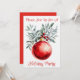 A Modern Elegant Holiday Party Invitation designed with a bright festive red ornament with green leaf and holly accent, on a white background. The front text includes: Please Join Us For A Holiday Party. The reverse text includes: The Date and Time, The Location and Address, The Host Details and RSVP Details, on a matching festive red background. To personalize, simply insert your party details into our easy template, replacing the sample text.