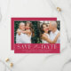 Announce your wedding date with this stylish, modern photo save the date card. The design features two of your favourite engagement photos with "Save the Date" in white serif and script fonts against a magenta background (or colour of your choice). Personalise the minimalist save the date announcements by adding your names, date and wedding location. The card reverses to a solid magenta background. The simple save the date announcement is perfect for any wedding theme.