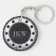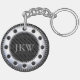 This sophisticated keychain features modern, elegant black and grey stripes and an easily modified monogram inside a rivet.
