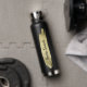 Modern water bottle featuring an abstract gold paint stroke and your name in an elegant brush script over a black background. A simple design with a feminine touch, perfect for a girly girl.