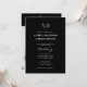 Chic luxurious wedding invitation using elegant White against a black background, adding monogram initials in a fancy unique font in front, artistic botanical leaves, and couple photo in the back.