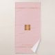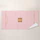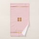Trendy luxury exclusive looking monogrammed bath towel set featuring a faux gold copper metallic glitter square and lines over a stylish classy blush pink background. + Personalise it with your name or family name and monogram name initial.