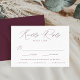 Minimalist, modern wedding RSVP card featuring your RSVP date, custom accepts/declines wording, and meal options. "Kindly Reply" is displayed in a wine-purple calligraphy script. The purple script wedding RSVP card was designed to coordinate with our Modern Elegance wedding collection.