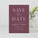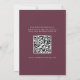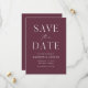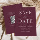 Announce your upcoming nuptials in style with our elegant, modern QR code save the date card. The non-photo save the date features "Save the Date" in white serif and script fonts with a wine-purple background. Personalise the front of the save the date card by adding your names, wedding date, wedding location, and other wedding details. The minimal save the date card reverses to feature your custom QR code with wedding website and custom text. Perfect save the date for both modern formal and casual weddings!