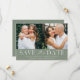 Announce your wedding date with this stylish, modern photo save the date card. The design features two of your favourite engagement photos with "Save the Date" in white serif and script fonts against a sage green background (or colour of your choice). Personalise the minimalist save the date announcements by adding your names, date and wedding location. The card reverses to a solid sage green background or colour of your choice. The simple save the date announcement is perfect for any wedding theme.
