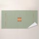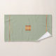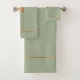 Trendy luxury exclusive looking monogrammed bath towel set featuring a faux gold copper metallic glitter square and lines over a stylish classy light sage green background. + Personalise it with your name or family name and monogram name initial.