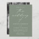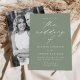 Minimalist, modern wedding invitation featuring your wedding details in simple white lettering with "the wedding of" in an elegant calligraphy script with a sage green background. The invite reverses to display your vertical engagement photo. Designed to coordinate with our Modern Elegance wedding collection.