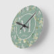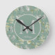 Modern Elegant Sage Green Silver Leaves Monogram Round Clock