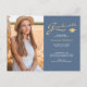 This double sided 2 photo stylish graduation announcement or thank you postcard, features modern text fused with elegant calligraphy script in gold colour and white on dusty blue. Photos are one on the front and one on the back. To see more items like this, visit my store here at "www.Zazzle.com/LakeViewCardCo". Thanks