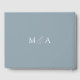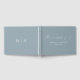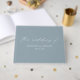 Elegant wedding guestbook featuring "the wedding of" displayed in a modern white calligraphy script on a dusty blue background. Personalise the front of the simple wedding guest book with your names and wedding date. The back of the dusty blue guest book displays your monogram initials. Add your married name and wedding date to the spine of the guest book.