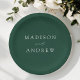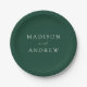 The elegant, personalised green wedding paper plates are perfect for your wedding reception, rehearsal dinner, engagement party, and more! The minimalist green wedding plates are perfect for summer, fall, winter, and spring weddings. The design features a chic modern calligraphy script with your names in white lettering on a dark green background. The design coordinates with our Modern Elegance Green wedding collection.