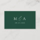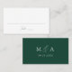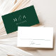 Modern wedding place cards featuring a dark green calligraphy script on a white background. The back of the green place cards feature your monogram initials with your wedding date shown below. The elegant script place cards are perfect for modern wedding receptions, rehearsal dinners, and other special events.