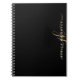 Personalised modern notebook with simple, elegant handwritten calligraphy script initials or monogram and name in gold and white against an editable black background for a stylish or professional look. CHANGES:  Change the background colour, choose a styled graphics background or change the text font style, colour, size and placement by clicking on EDIT in the PERSONALIZE section for a custom design. ASSISTANCE:  For help with design modification or personalisation, colour change, resizing, transferring the design to another product or if you would like coordinating items, contact the designer BEFORE ORDERING via the Zazzle Chat MESSAGE tab below or email makeitaboutyoustore@gmail.com.