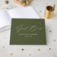 Elegant wedding guestbook featuring "Guest Book" displayed in a modern white calligraphy script on an olive green background. Personalise the front of the simple wedding guest book with your names and wedding date. The back of the olive green guest book displays your horizontal engagement photo. Add your married name and wedding date to the spine of the guest book.