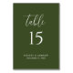 Modern Elegant Script Olive Green Wedding Table Number. This minimalist elegant design features boldly written table number, bride and groom's names and date of wedding on olive green background. Personalise it with your information. View the matching collection.