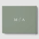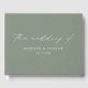 Elegant wedding guestbook featuring "the wedding of" displayed in a modern white calligraphy script on a sage green background. Personalise the front of the simple wedding guest book with your names and wedding date. The back of the sage green guest book displays your monogram initials. Add your married name and wedding date to the spine of the guest book.